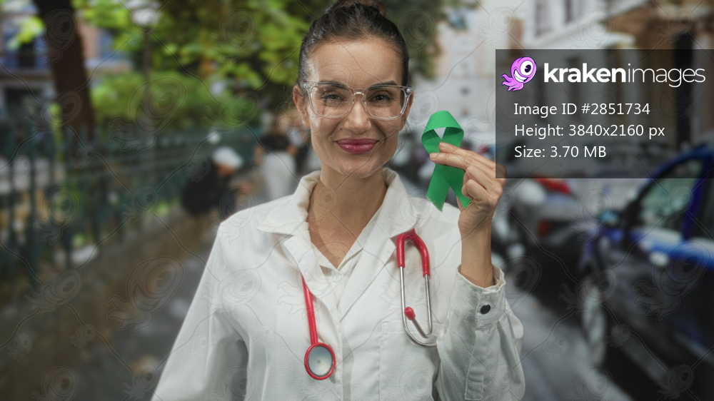 Female doctor with stethoscope holds green ribbon on city street; health awareness support compassion.