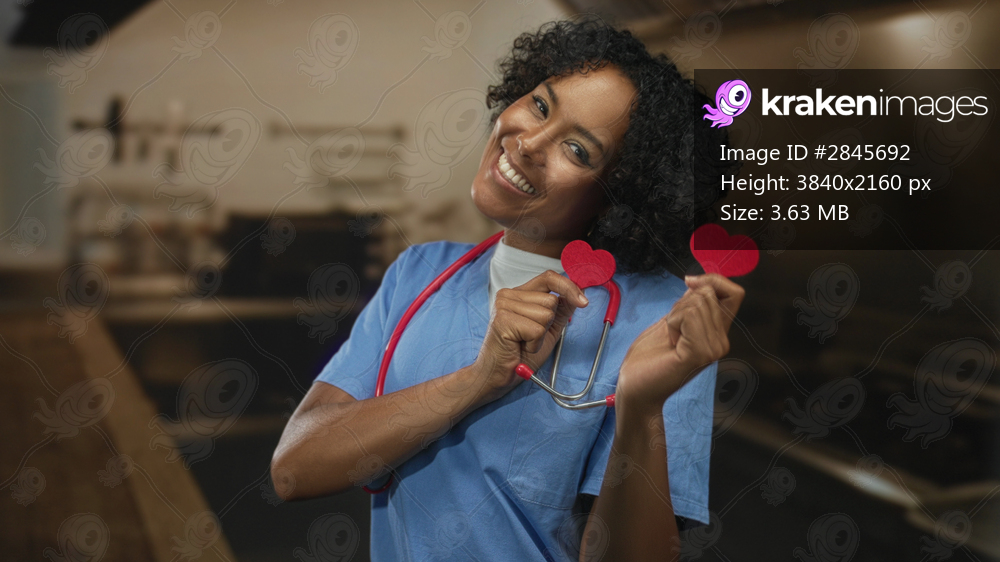 Female doctor wearing blue scrubs and stethoscope holds red paper heart shapes over her eyes with both hands in a studio building; compassion.