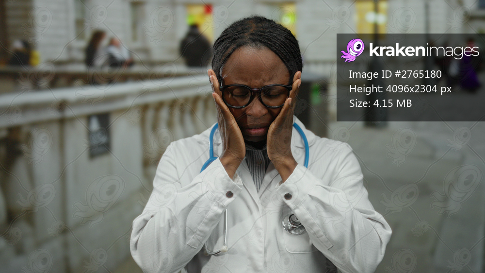 Female doctor wearing white coat and stethoscope, looking stressed on city street, hands on glasses, illustrating medical stress in urban settings.