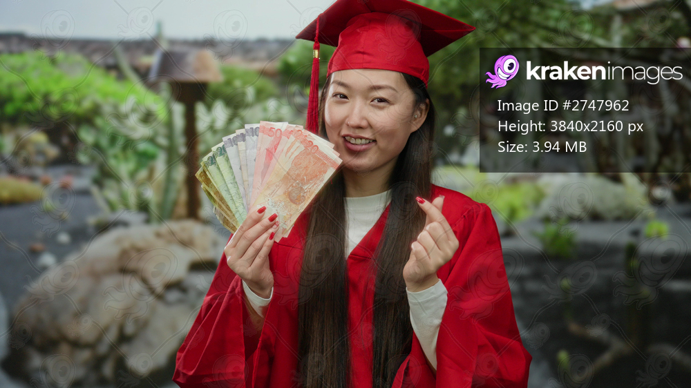 Female graduate in red holding philippine peso notes in an outdoor park, showcasing financial success and achievement.