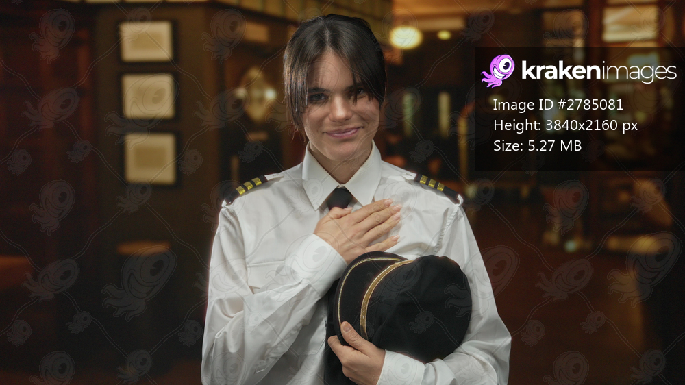 Female pilot in uniform stands in a hotel lobby with hand on chest, holding hat, expressing gratitude, conveying professionalism and warmth in an indoor setting. - Kraken Images