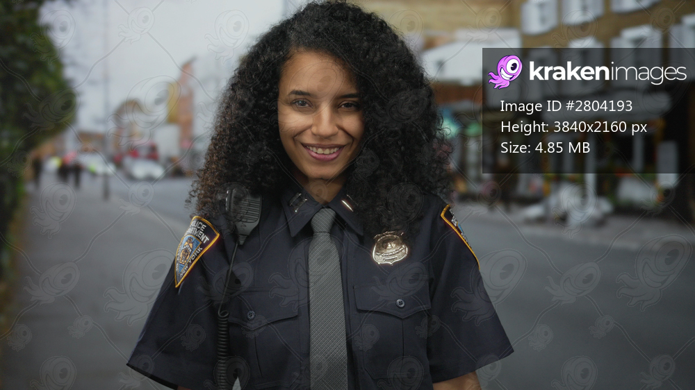 Female police officer presses lips and blows a kiss toward camera while standing in a busy street scene; affection.