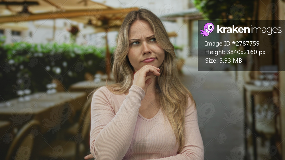 Female presents both open palms outward gesture on a busy restaurant terrace during daytime; indecision uncertainty choice doubt.