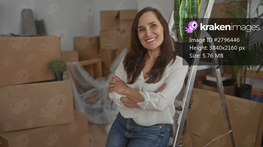 Female sits on metal ladder near cardboard boxes and crosses bare arms in new home room; denial rejection.