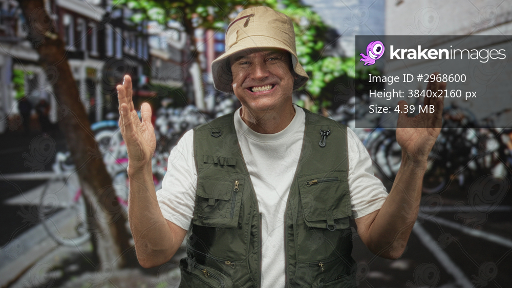Fisherman man raising hands and smiling, wearing olive fishing vest and beige bucket hat, white shirt, standing before parked bikes on urban street; joyful leisure. - Kraken Images