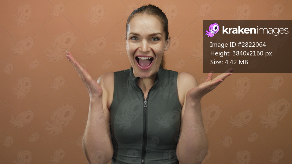 Fit athletic young woman covers mouth with manicured hands against bright orange studio wall; surprise.