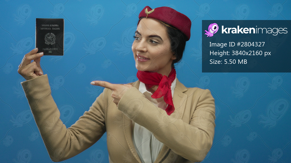 Flight attendant in uniform pointing at italian passport against blue wall background for identification purposes with a confident smile.