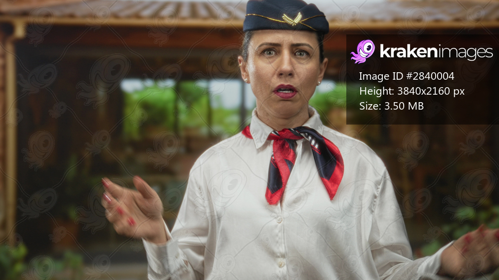 Flight attendant in white blouse and navy cap stands with hands on hips at building entrance; stern authority.