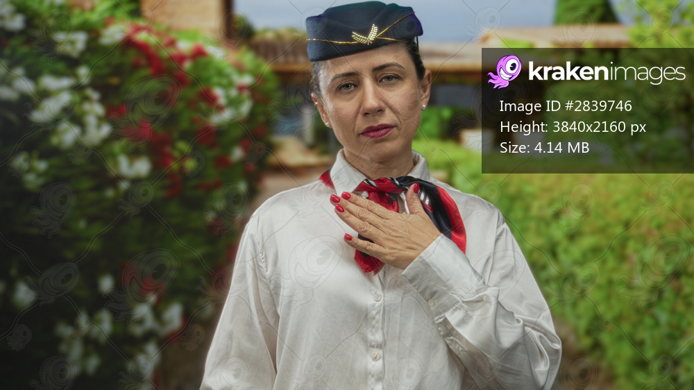 Flight attendant woman hand on chest and palm raised at building entrance; trust commitment solemnity.