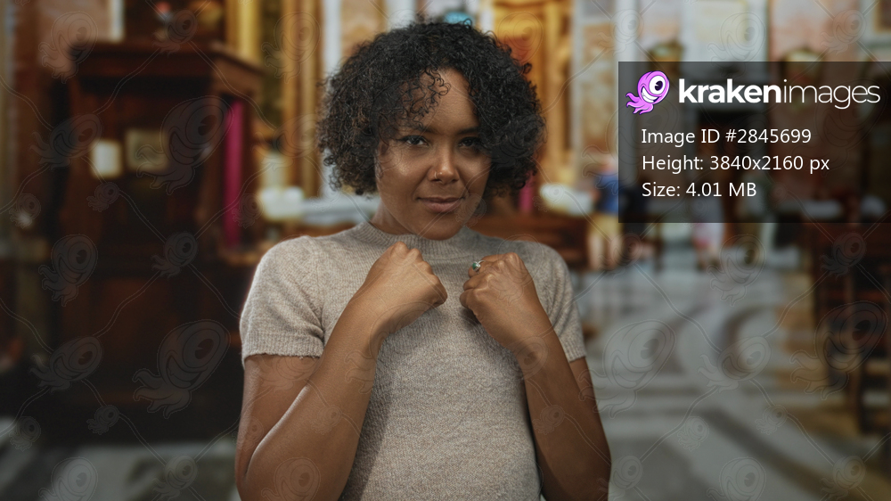 Focused woman throws a straight punch with raised fist and clenched knuckles in church building; determination.