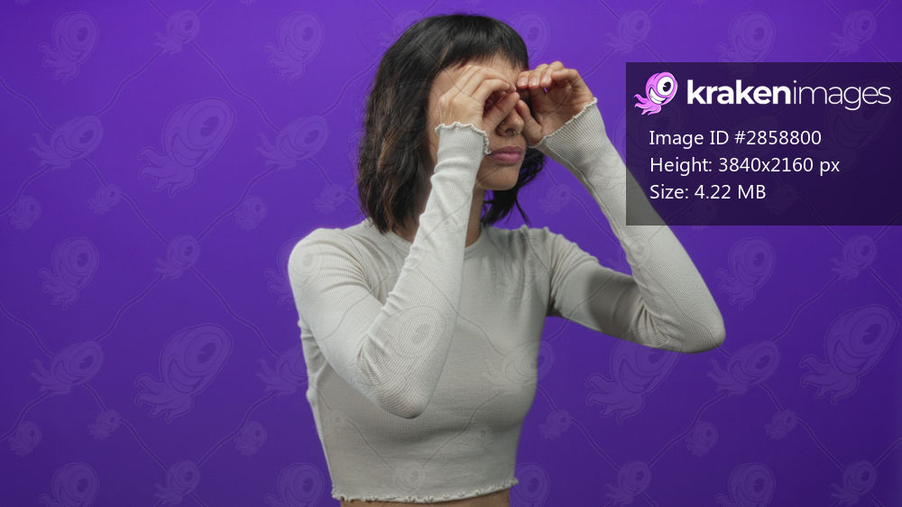 Focused young woman eyes framed by hands gesture in purple studio; curiosity wonder discovery exploration.