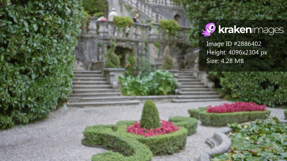 Formal garden with clipped hedges, gravel parterres and stone steps, softly blurred bokeh garden; backdrop copyspace template calm.
