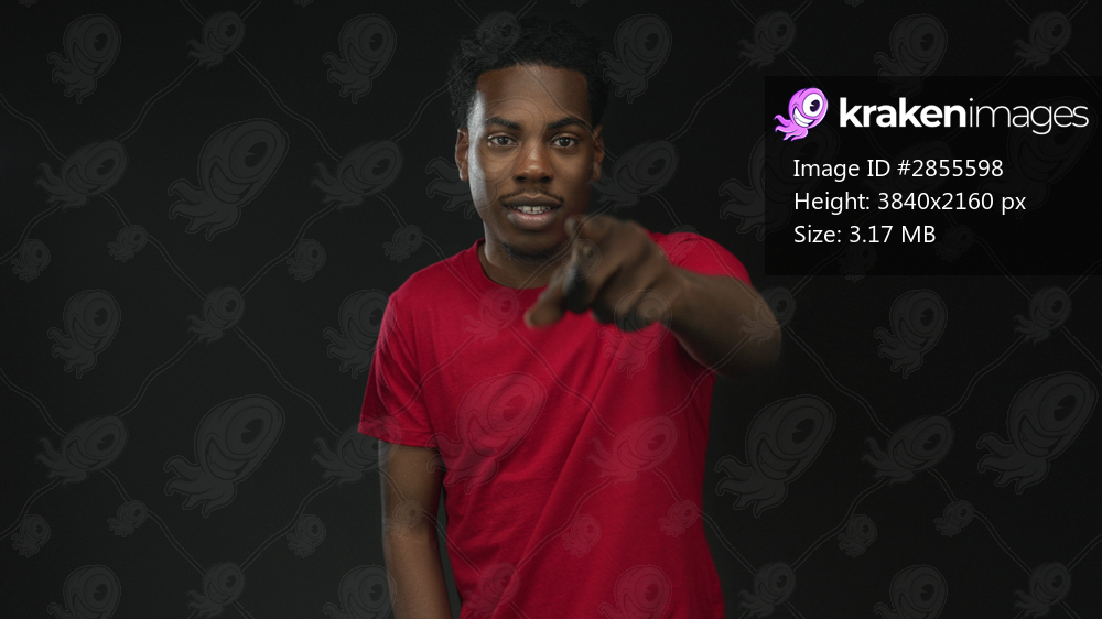 Friendly smiling young african american man pointing finger in studio against black wall wearing red shirt; confidence.
