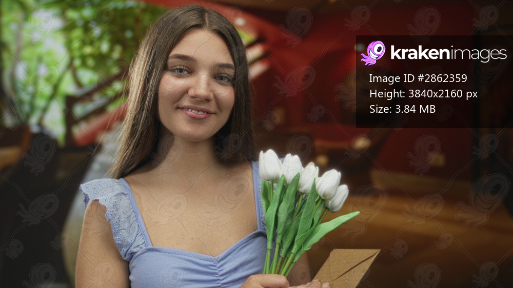 Gently smiling teenage girl holding white tulips and an envelope in a hotel building interior; gratitude.