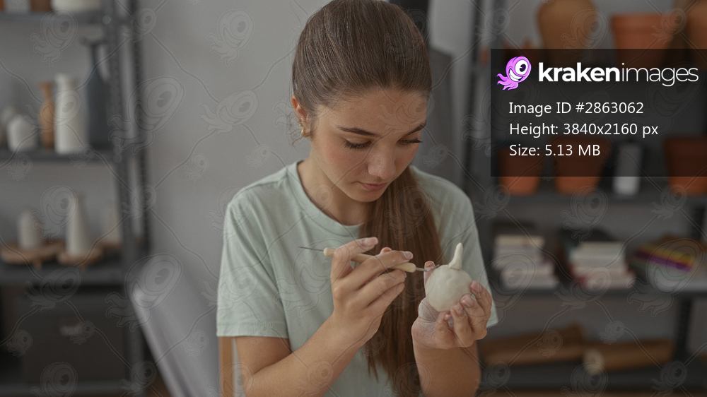 Girl carves white clay figurine with carving tool using bare hands in pottery studio; creative passion concentration.