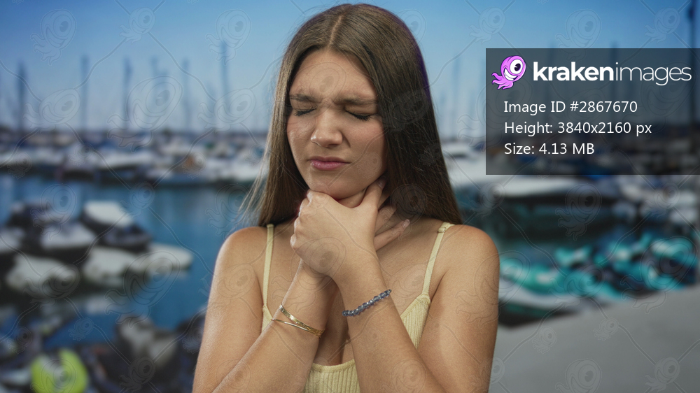 Girl clutching throat at port boat dock in sunlight with closed eyes showing signs of pain; distress.