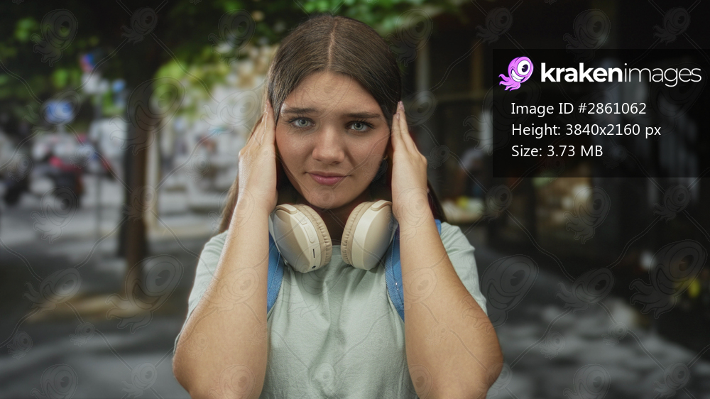 Girl covers ears with beige headphones around neck on busy urban street lined with storefronts; discomfort.