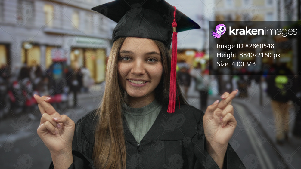 Girl crosses fingers wearing graduation mortarboard cap and gown on busy city street among blurred pedestrians; hope.