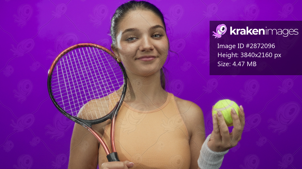Girl grips tennis racket and ball in purple studio while smiling at camera in sporty pose; confidence.
