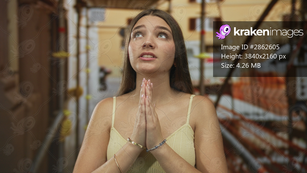 Girl with hands clasped and eyes closed at building construction site under warm sunlight offering a quiet prayer; faith.