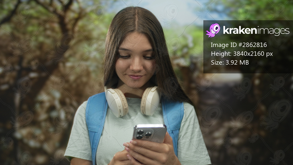 Girl holding smartphone and tapping screen on green forest park path under sunlight breeze; serenity connection.