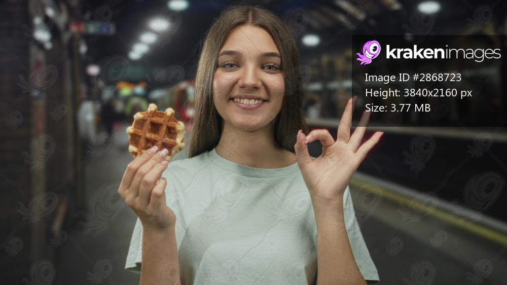 Girl holding waffle at a busy indoor railway station platform with blurred passengers and trains in view; youthful joy contentment happiness.