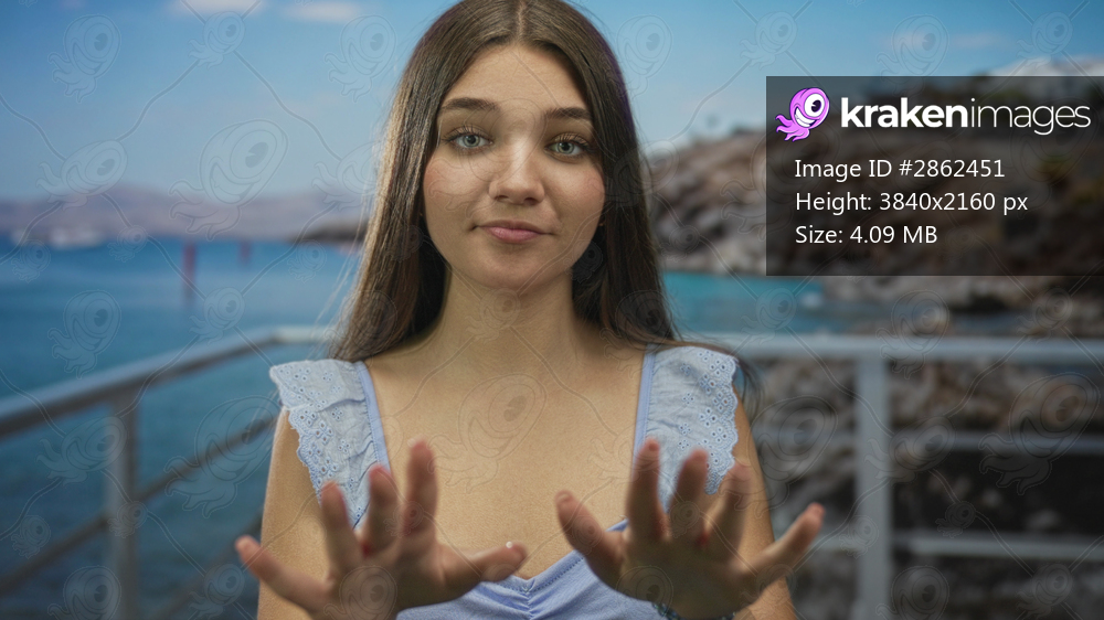 Girl holds her hands forward in a stop gesture at a rocky seaside railing under bright sunlight; serenity.