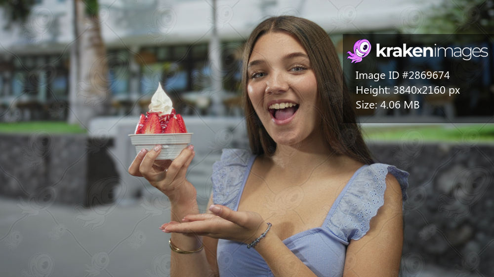 Girl holds strawberry ice cream bowl with hand and smiles brightly in front of building facade; joy.