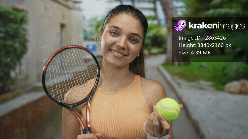 Girl holds tennis racket and ball in hand by a building under green trees lining a walkway; pure happiness.