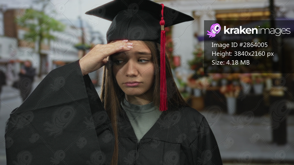 Girl in black graduation gown and mortarboard touches her cheek with hand on a busy city street near flower stand; doubt.