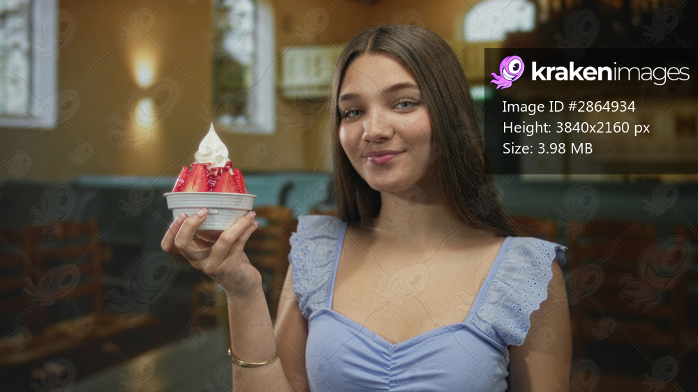 Girl in blue dress holds strawberry bowl and points finger to dessert in historic church hall; delight.
