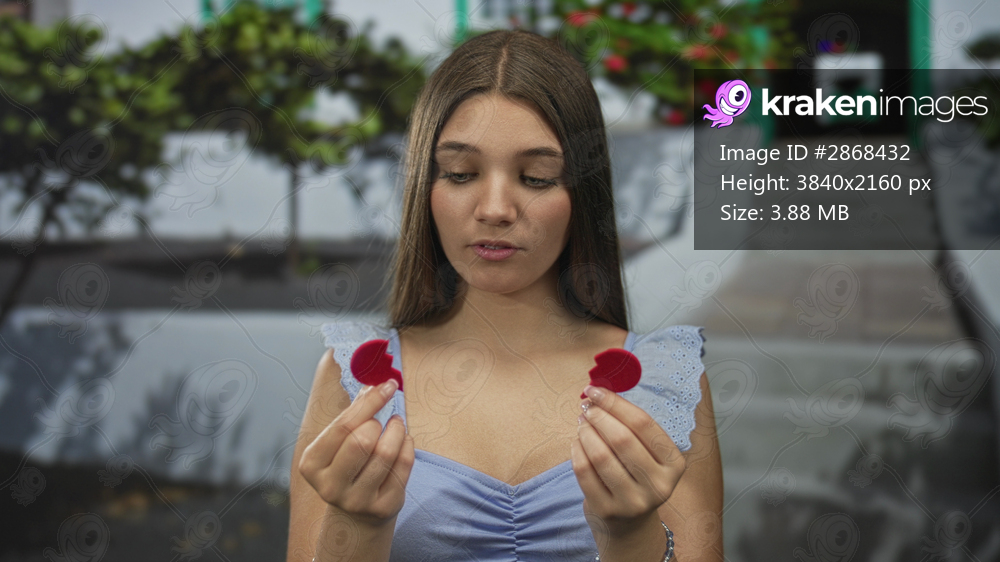 Girl in blue dress rips heart with bare fingers against front building steps in sunlight; heartbreak sadness.