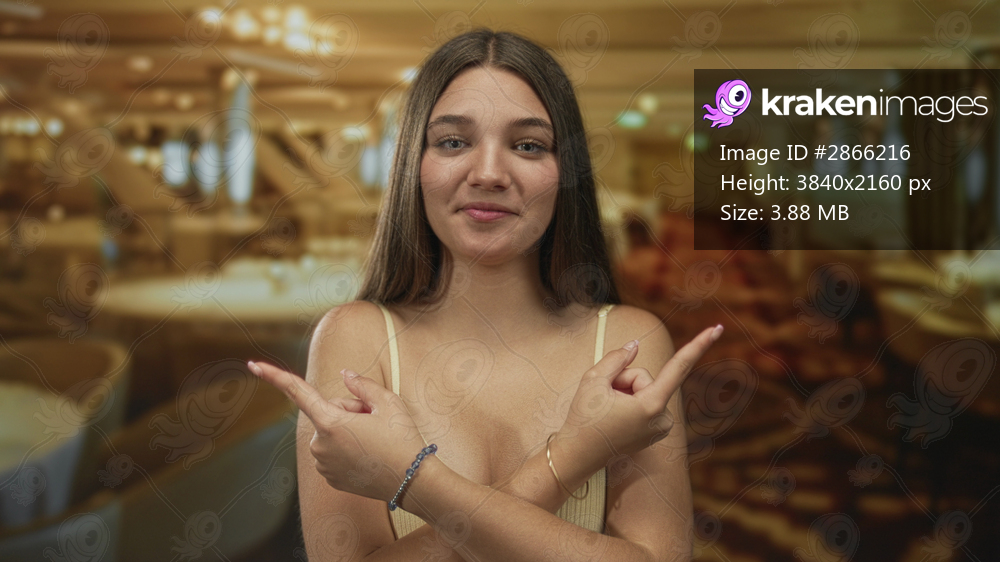 Girl in yellow top smiling and pointing finger in building restaurant under bright lights; uncertainty doubt.