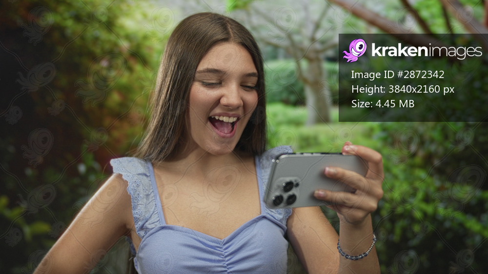 Girl with long brown hair and bare shoulders holding smartphone and smiling among sunlit green trees in forest; joy.