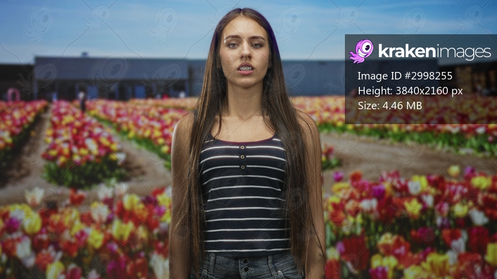Girl with long hair looking down, lips pressed, standing before a building and tulip field; contemplation solitude.