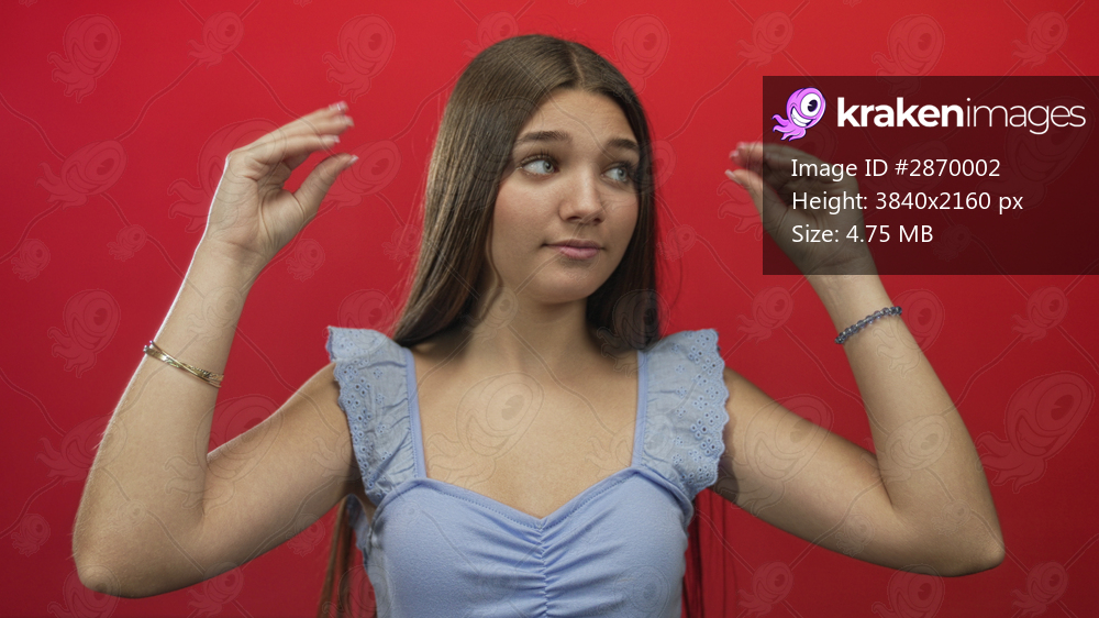 Girl making hand talking gesture in studio with red backdrop, raised hands visible and blue sleeveless top; playful curiosity.