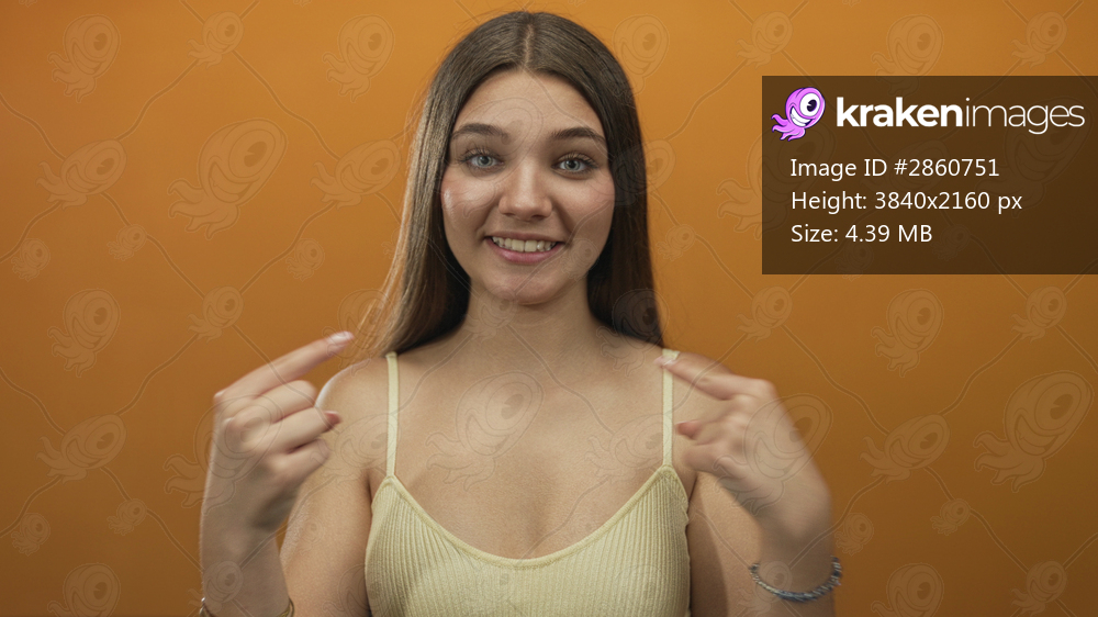 Girl pointing finger to cheek confidently in bright orange studio setting while smiling gently; playfulness.
