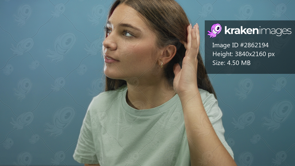 Girl with raised hand gesture and visible fingers pointing slightly forward in blue studio; quiet contemplation.