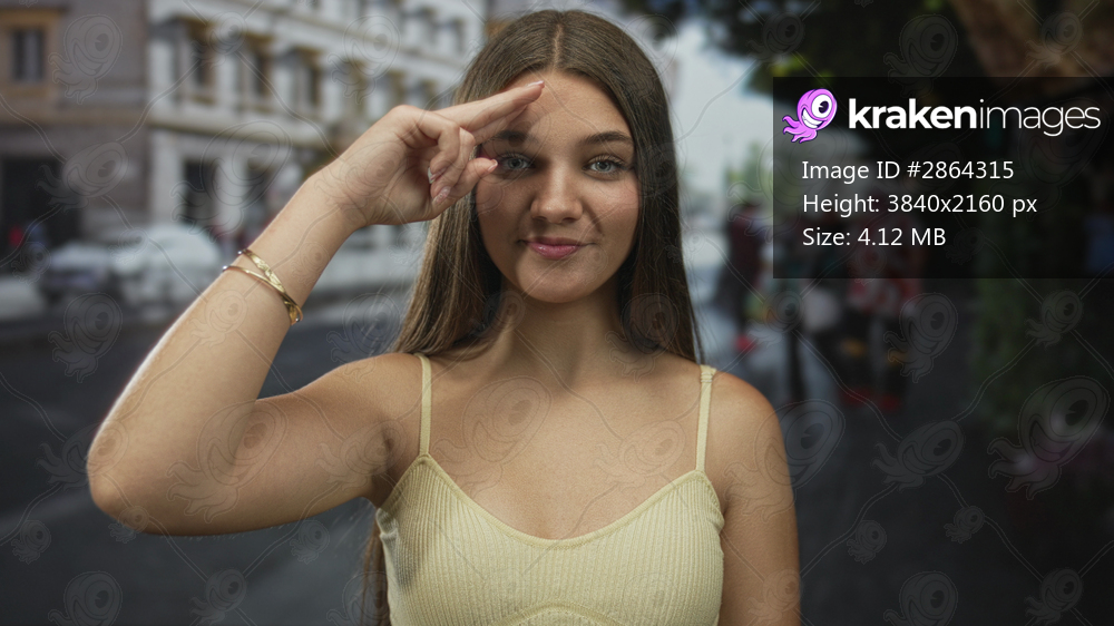 Girl raises hand to forehead as a casual salute on a busy city street lined with modern buildings and blurred pedestrians; joy.