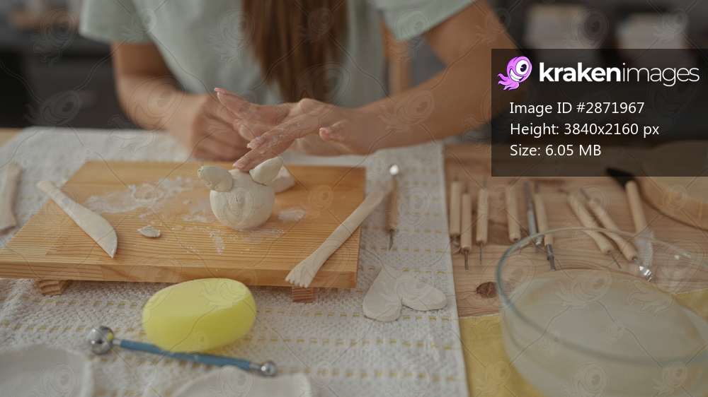 Girl sculpts wet clay on wooden table with hands in art studio, forming small pot beside pottery tools; creative passion.