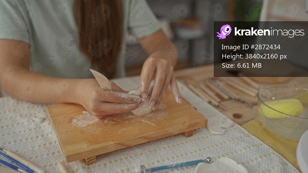 Girl sculpts white clay on wooden board with carving tool in studio; serenity artistry craftsmanship.
