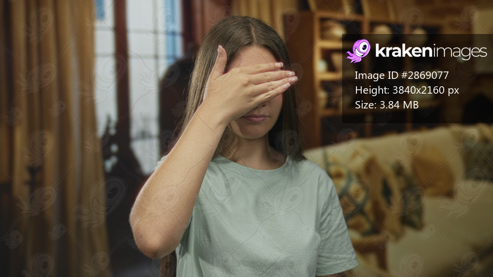 Girl seated on sofa covers eyes with hand inside building living area featuring wooden shelves and decorative pillows; embarrassment.