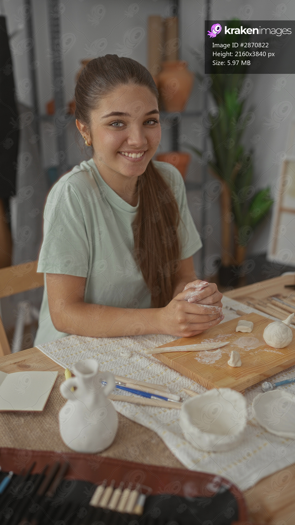 Girl shaping clay with both hands on a wooden table in a pottery studio with ceramics tools visible; creative joy.