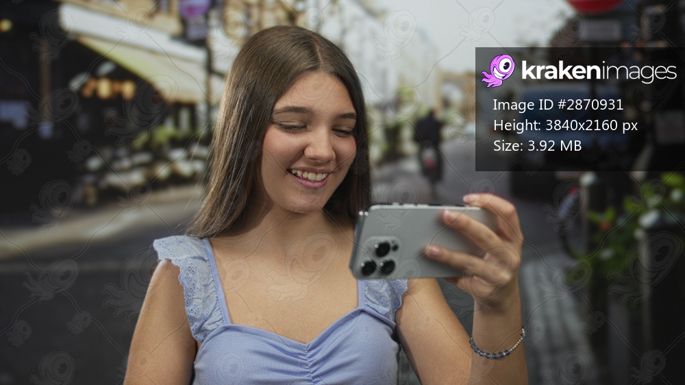 Girl smiles tapping smartphone with finger on busy city street; social connection digital happiness.