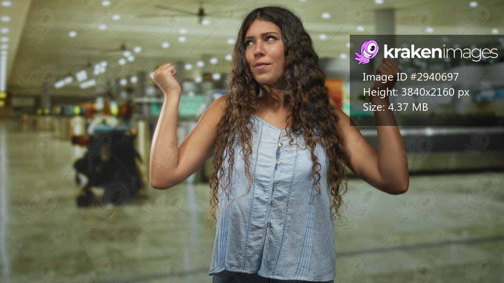 Girl smiling with raised fists near baggage carousel and conveyor belt in busy airport terminal; joy travel excitement.