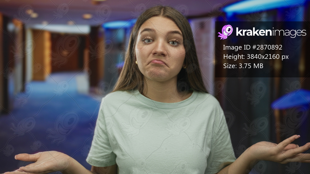 Girl touches ear and raises palm in hotel building hallway with neutral expression under soft lights; confidence.