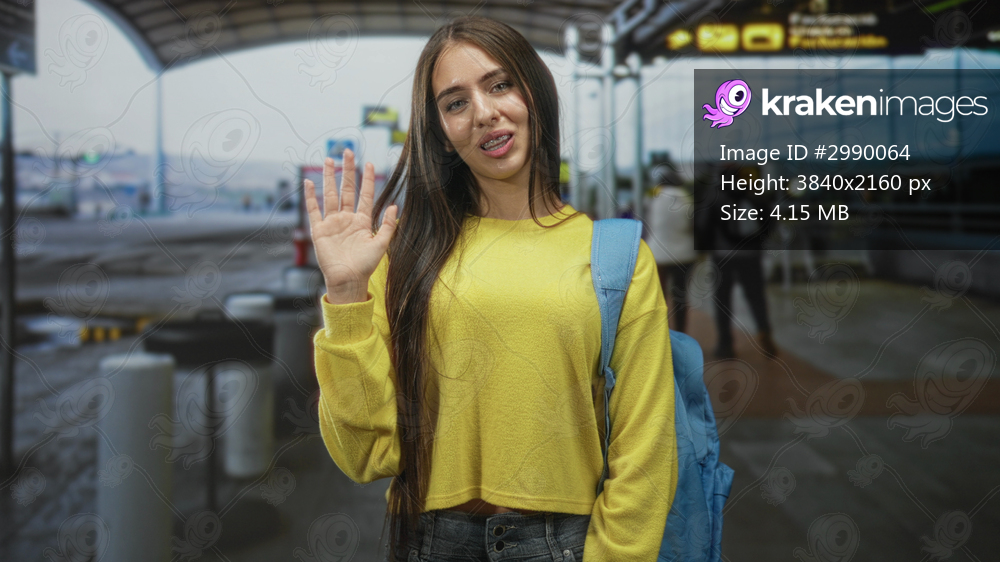 Girl waves hand at airport dropoff wearing yellow sweater and blue backpack, smiling with braces and long hair; farewell joy.