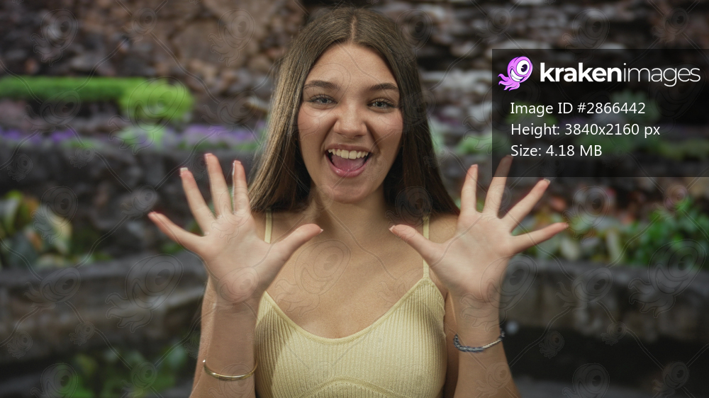 Girl waves hands with bare shoulders in sunlit green forest showing broad smile and playful gesture; joy.