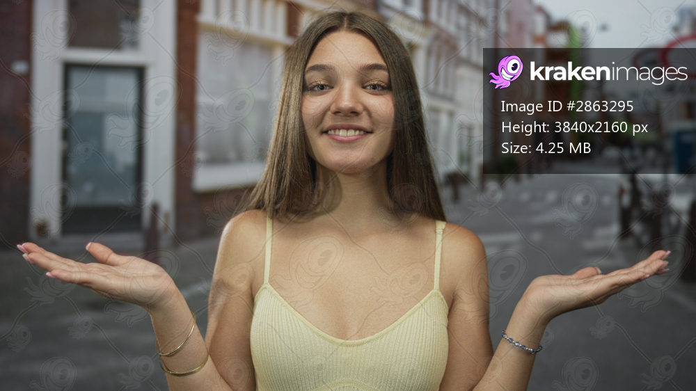 Girl wearing a yellow tank top raises both palms in a questioning gesture on a street lined with brick buildings; balance choice uncertainty indecision. - Kraken Images