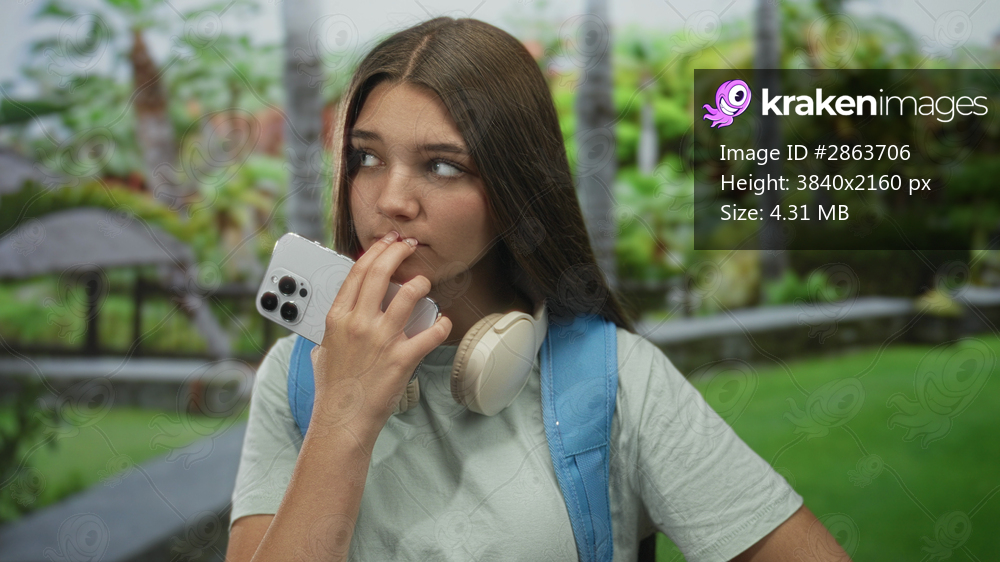 Girl wearing blue backpack and white headphones holds smartphone and finger to lips in forest; contemplation.